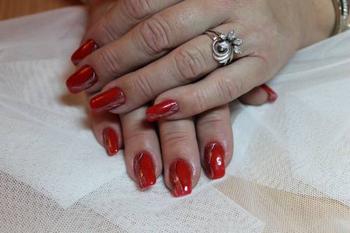 коррекция ногтей гелем. Покрытие красным гель-лаком + роспись